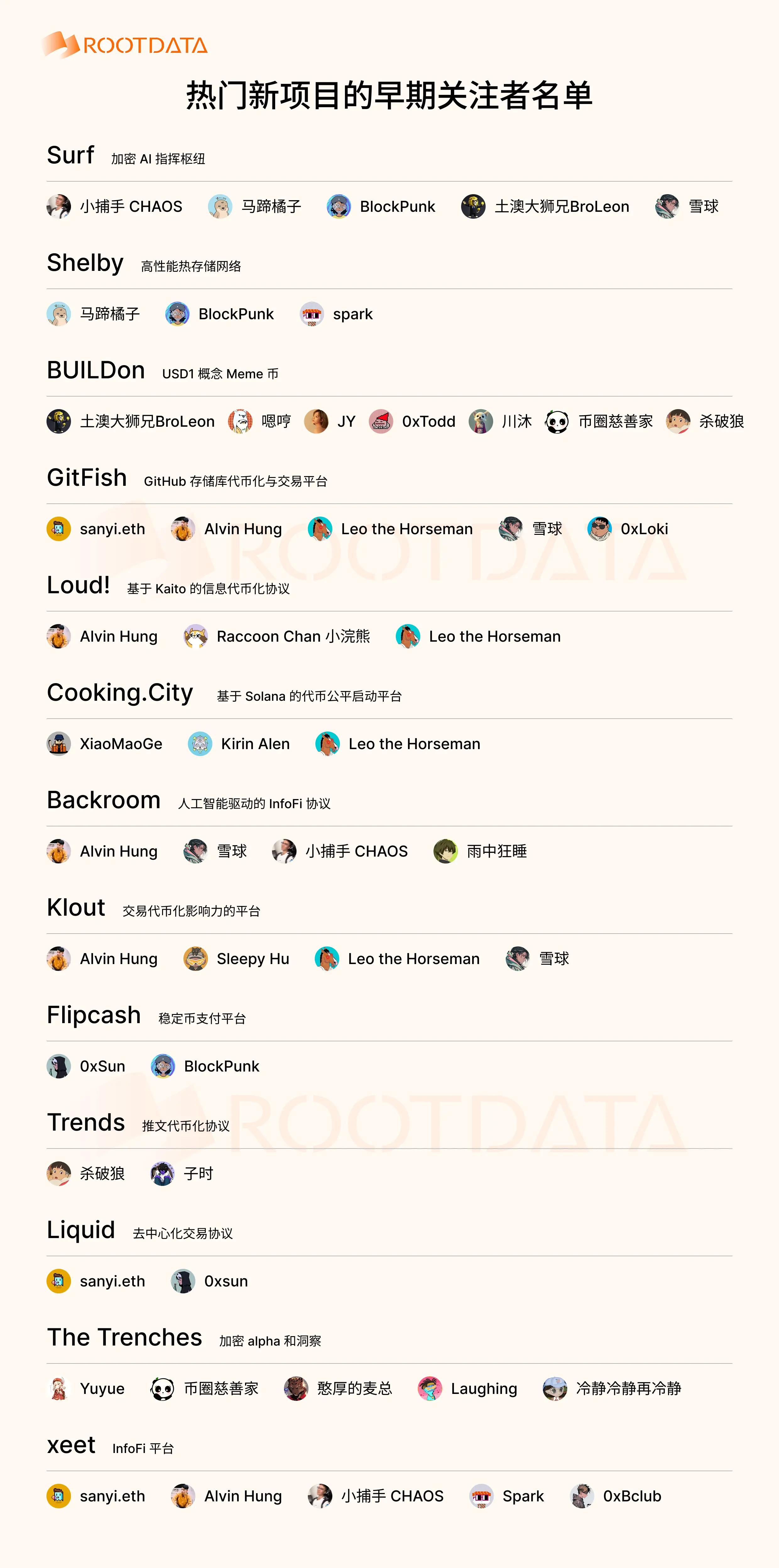 对此, RootData 统计了最近 2 个月平台热度值曾超过 200 的项目中,在热度值大涨前就关注这些项目的最早期中文 KOL 关注者列表。 由于大部分数据从今年 5 月初开始记录,因此项目样本也仅限于今年成立并从 5 月开始在 X 平台活跃的项目。