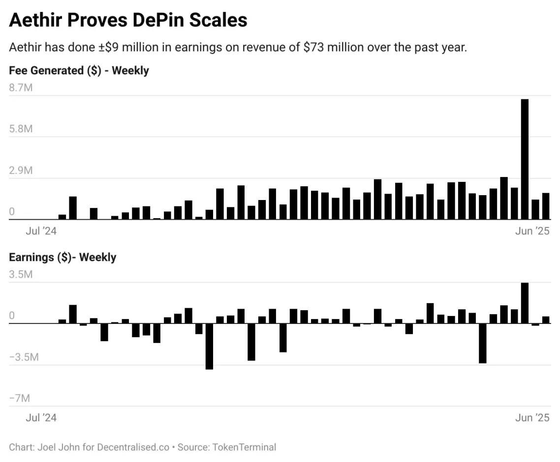 去年 AI 热潮爆发时,高端 GPU 租赁短缺。Aethir 搭建了 GPU 算力市场,其客户还包括游戏行业。对数据中心运营者而言,Aethir 提供了稳定收入来源。截至目前,Aethir 自去年底累计收入约 7800 万美元,盈利超 900 万美元。它在加密推特上「火爆」吗?未必。但其经济模型可持续,尽管代币价格走低。这种价格与经济基本面的背离,定义了加密领域的「 vibecession」(氛围衰退),一端是用户寥寥的协议,另一端是收入激增但代币价格未反映的少数产品。