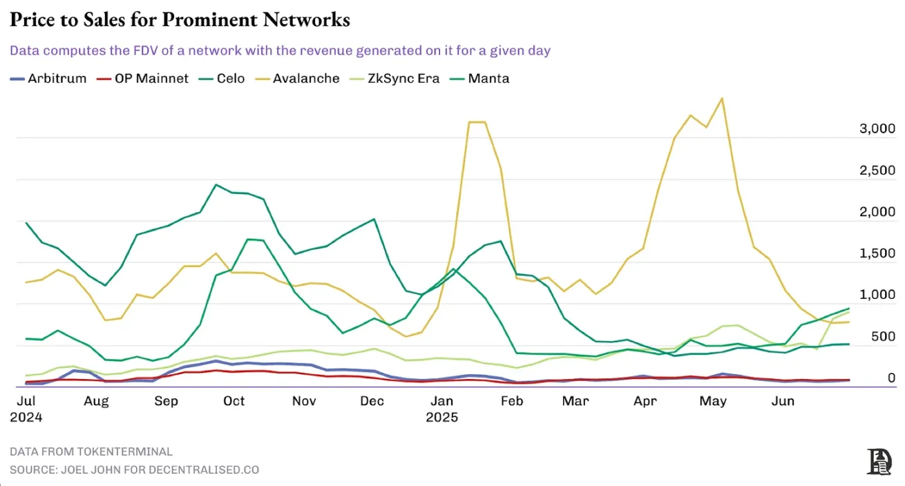下表选取了近年建设的网络样本,数据反映经济现实。Optimism 与 Arbitrum 的 P/S 率维持在较可持续的 40-60 倍,而某些网络该数值高达 1000 倍。