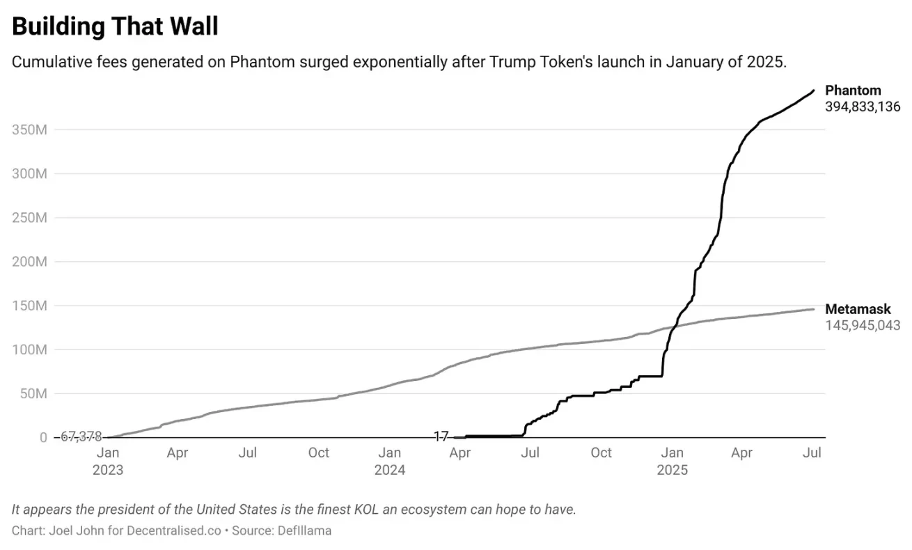 类似分化也出现在 Phantom 与 Metamask 钱包之间。DeFiLLama 数据显示,Metamask 自 2023 年 4 月累计产生 1.35 亿美元手续费,而 Phantom 自 2024 年 4 月已创收 4.22 亿美元。尽管 Solana 的 meme 币生态规模更大,但这指向 Web3 的更广泛趋势。Metamask 作为 2018 年问世的老牌产品,其品牌认知度无可匹敌;而 Phantom 作为后来者,因精准布局 Solana 生态且产品卓越,获得丰厚回报。