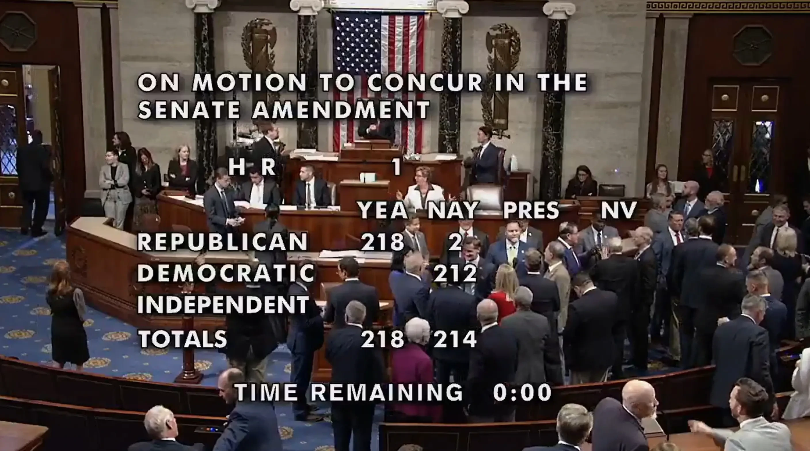 7 月 3 日,众议院再度表决参院版本,以 218 票对 214 票的相同差距完成最终通过。期间,民主党领袖杰弗里斯为拖延程序,单人演讲达 8 小时 46 分钟,创下众议院最长记录。