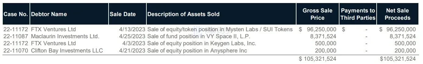 FTX 在 2022 年以约 1 亿美元换得 Mysten 股权及 8.9 亿 SUI 代币的认购权,但清算团队在 2023 年就以 9600 万美元的价格处理掉这笔资产,理由是「快速回笼资金」。