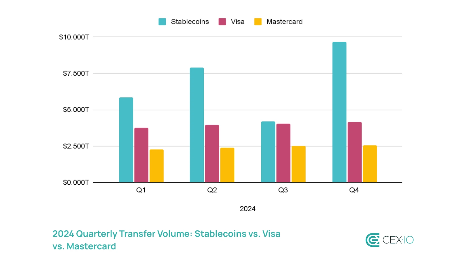 Figure 2. 2024 Quarterly Transfer Volume: Stablecoins vs. Visa vs. Mastercard. Source: https://blog.cex.io/ecosystem/stablecoin-landscape-34864
