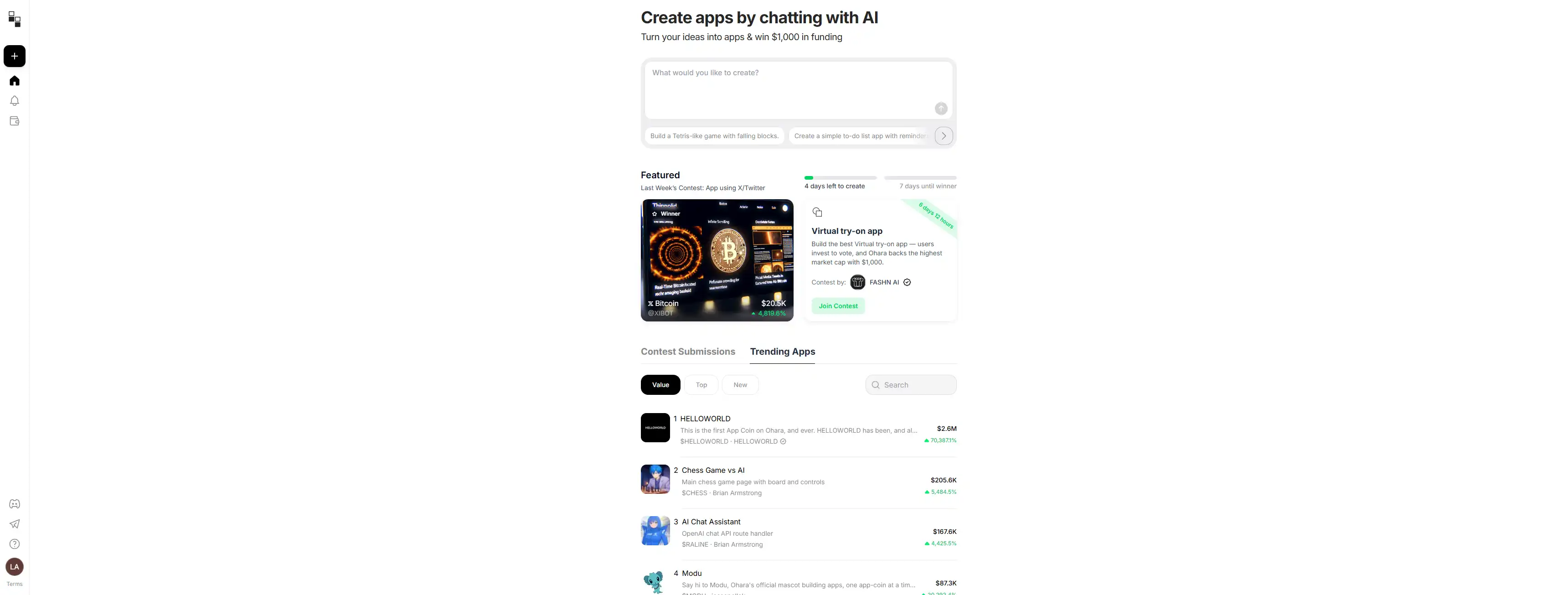 目前平台市值最高的代币是一个叫 $HELLOWORLD 的 meme 币,这个应用点进去就是一个按钮,跳转到 Ohara 的首页。这也是该平台的第一个代币,目前市值约为 260 万美元。