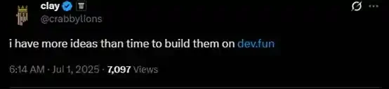 $buidl 目前的市值也仅仅只有 300 万美元不到,能够成为 dev.fun 上目前的头牌,除了过往孵化比较成功的原因外,就是 dev.fun 团队和该项目的互动比较紧密,团队成员日常发推也多次提及。鉴于孵化器的这个定位,被市场认为是一个「半官方」性质的币。(注:buidl 并非 dev.fun 的官方代币,dev.fun 目前也没有官方代币)