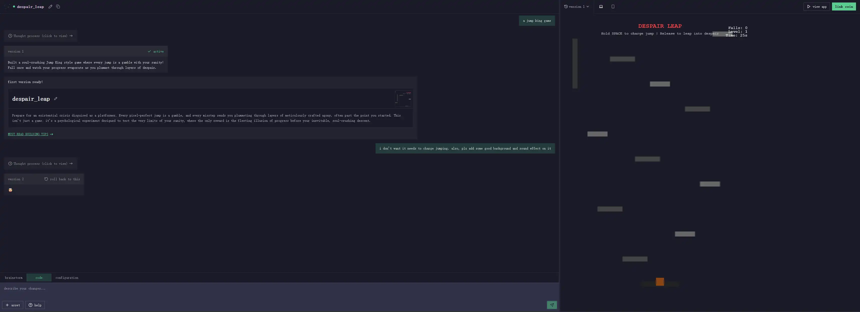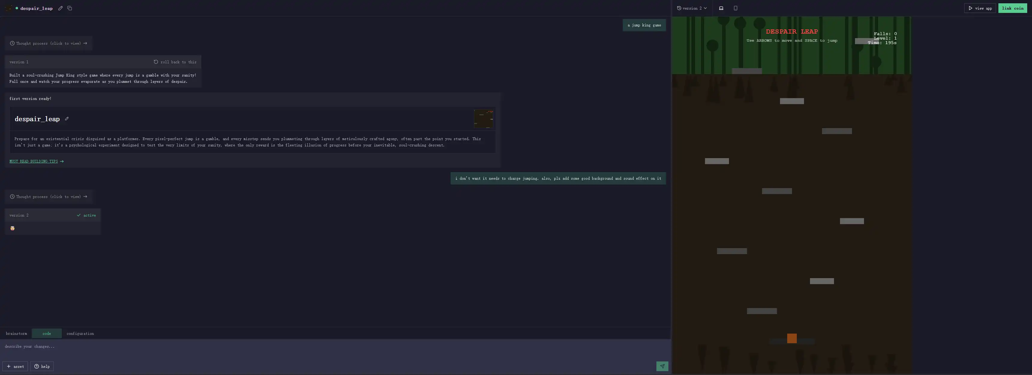 只需要在该平台上用口头语言来描述自己的需求,平台就会自动开始写代码,并且呈现出一个可用的 App。例如,我让平台帮我做一个跳跃游戏,初步呈现的结果如下: