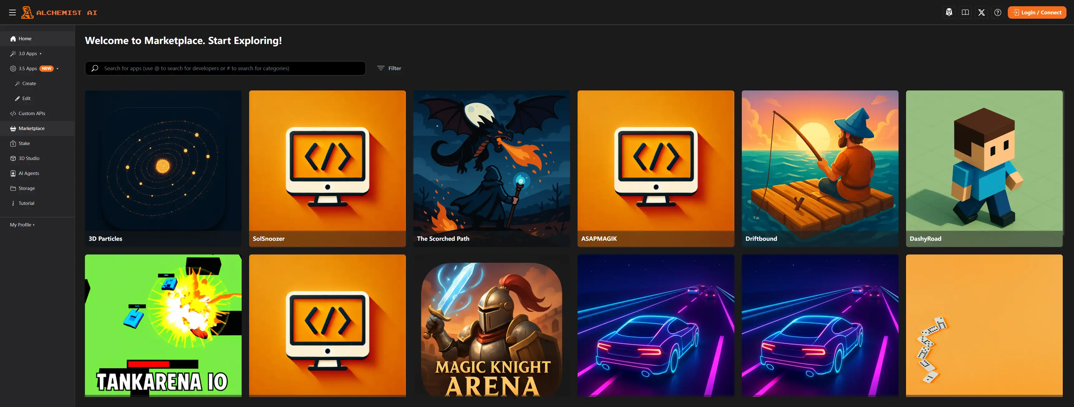 这个平台已经发了代币 $ALCH。和上面的项目相比,我认为它最大的不同在于整体的经济机制设计。在 Alchemist AI 上创建 App 是需要用到 $ALCH 的,它还有内置应用交易市场,在市场中可以使用 $ALCH 进行买卖。