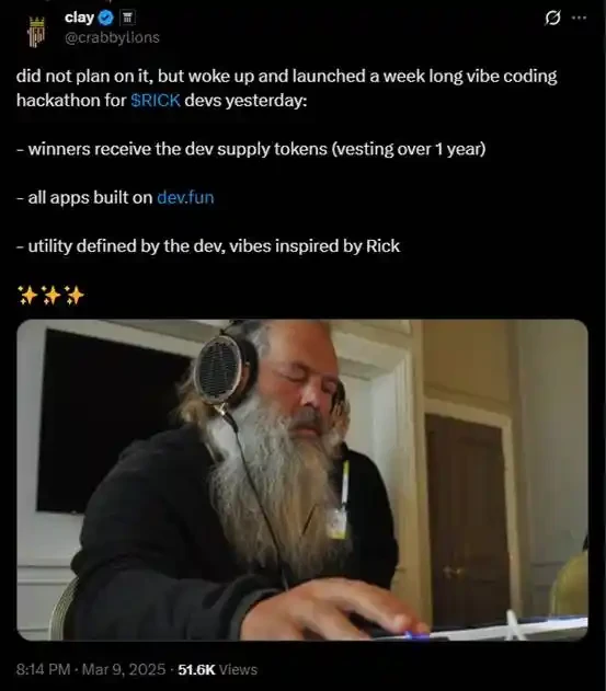 回到 dev.fun 本身,Colosseum 的人一直都挺用力奶 dev.fun 的。比如 @crabbylions 在 dev.fun 上发起过 $RICK 黑客松: