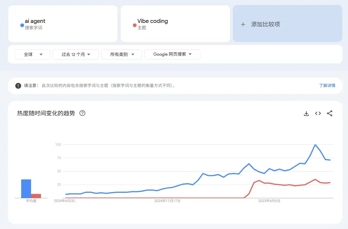 从 Google 的搜索情况上看,vibe coding(下图橙色曲线)在今年的 3 月初取得突破,差不多达到去年币圈 AI Agent 牛市(2024 年 11 月至 2025 年 1 月)时「AI Agent」关键词的搜索水平(下图蓝色曲线)。