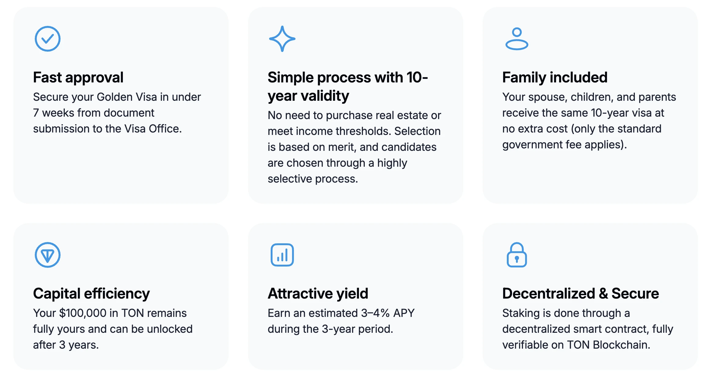 TON 基金会官网强调了此方案的若干优势,包括 从提交材料起约七周内快速审批、无需购置房产或达到收入门槛的简单流程,并可将配偶、子女和父母等家庭成员一同纳入签证申请且无需额外费用 。这一项目被宣传为相较传统途径更具成本效益的替代选项——传统申请黄金签证通常需至少约 54 万美元(400 万人民币)投资房产或定存等高额且低流动性的资产。Telegram 创始人也在社交媒体上转发了相关消息,引发了更广泛关注。
