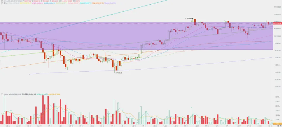 7 月 2 日,BTC 再次验证了“牛市第一上升趋势线”,但全周大部分时间均运行于 108000 美元一线,并进行了 8 个月以来第对 110000 美元历史高点的第三次冲击。