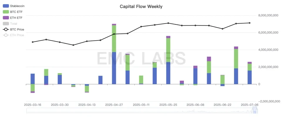 四五月大反弹之后,资金流入出现分化,稳定币通道资金开始减弱,而 BTC Spot ETF 通道资金则相对旺盛且稳定。