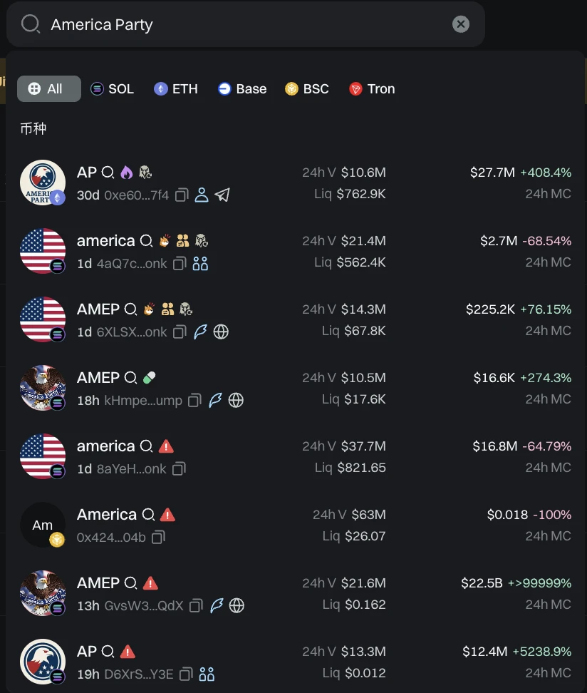 据 GMGN 网站信息,AP(美国党首字母)、AMEP、America、america 等一系列大小写名称 Meme 币已然充斥 ETH、SOL、BSC 等多个生态,但在经历了昨日的疯狂炒作之后,目前多数 Meme 币已经一地狼藉,市值纷纷腰斩甚至脚底斩。