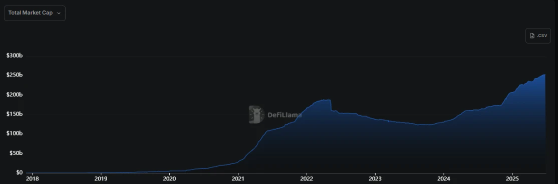 如上图所示, 2021-2022 年稳定币总市值约增长 5 倍,而本轮(2023 下半年-2025)仅增长 2 倍。乍看之下似乎是有机且健康的稳步增长,但实际具有误导性:当前市值仅比 2021 高点高 ~ 25 %,以 4 年维度看任何行业都属低速。这还是在稳定币迎来最明确监管顺风、且出现强力挺币总统的背景下。