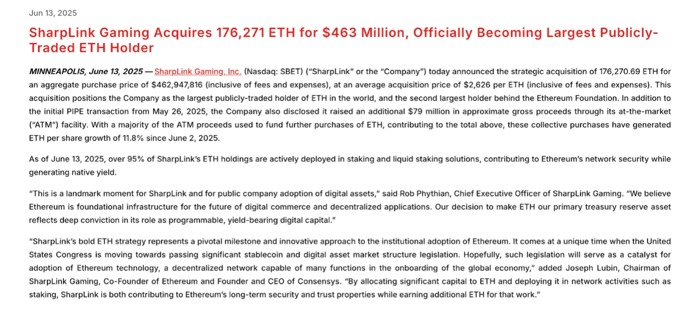 越来越多的大资金玩家正将 Ethereum 视为战略资产,这一趋势因 SharpLink Gaming 的一项引人注目的举措而加速。纳斯达克上市公司 SharpLink 最近完成了一笔具有里程碑意义的资金配置:收购了 176, 000 枚 ETH(约 4.63 亿美元),将以太坊作为其主要储备资产,一夜之间成为全球最大的公开 ETH 持有者。目前,这笔资产中超过 95% 已投入质押,以赚取收益并增强以太坊网络的安全性。