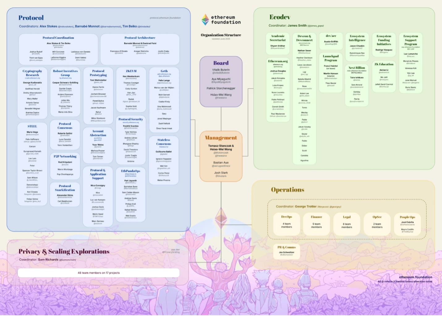 这次重组将决策权与执行权清晰分离,形成 “董事会—管理层” 双层治理架构,从而分散单点风险、提升执行效率,并为核心研发(Protocol & Privacy & Scaling)、生态发展(Ecodev)与运营支持三大板块提供更顺畅的协作通道。