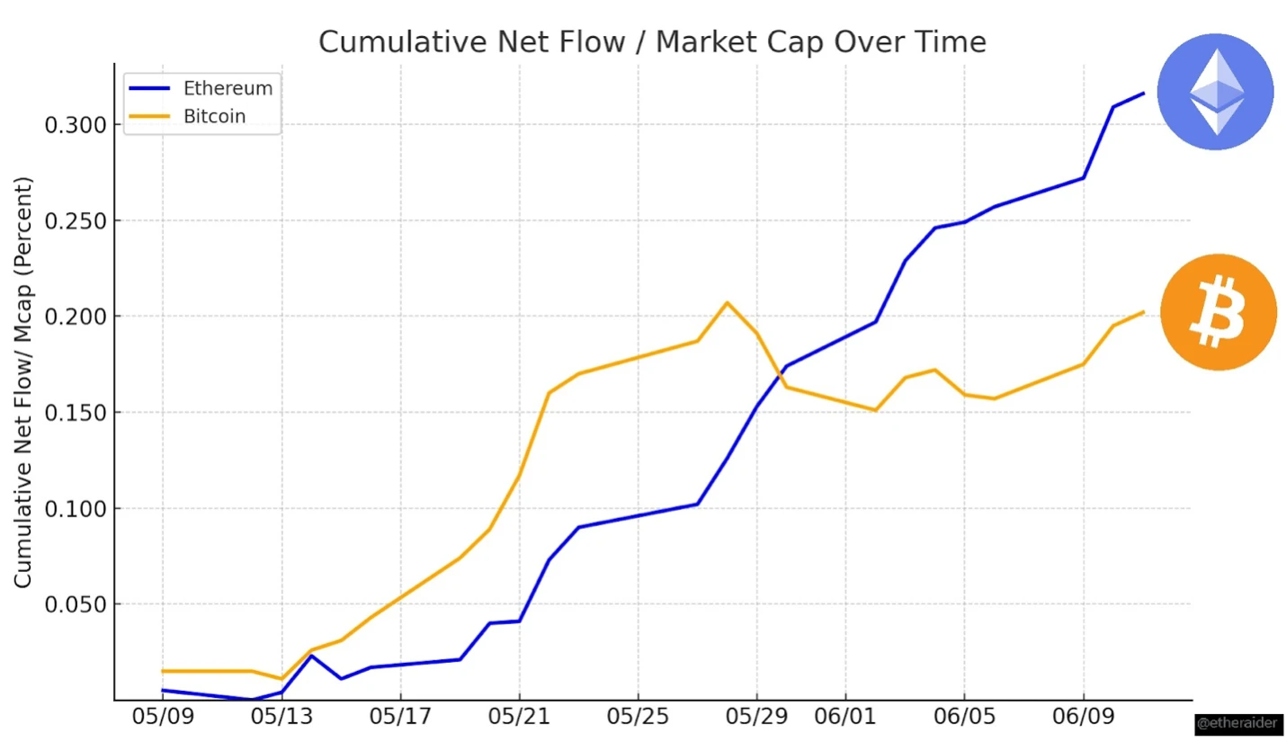 截至 2025 年 6 月 12 日,以太坊现货 ETF 已连续 19 个交易日录得正向资金流入,打破加密 ETF 历史上的连续净流入记录;其中, 6 月 11 日单日净流入高达 2.4 亿美元,不仅远超比特币 ETF 同期的 1.65 亿美元,更凸显了市场对 ETH 的偏好正在增强。