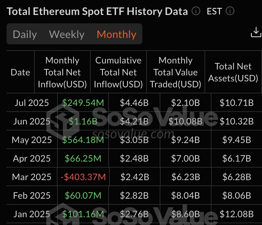 2025 年 6 月当月的以太坊现货 ETF 净流入突破 11 亿美元,创下 2025 年以来的单月新高,占据当前累计净流入总额(41.8 亿美元)的 27% 以上,显示出机构资金正快速、大规模地进驻以太坊市场。更重要的是,这并非短期资金异动,而是一波持续性的配置趋势:
