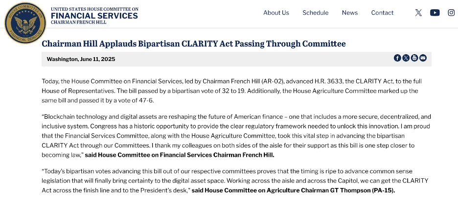 《CLARITY 法案》率先由众议院推进。2025 年 6 月 13 日,该法案已分别在金融服务委员会和农业委员会以 32: 19 与 47: 6 的表决结果获得通过。目前,法案已进入规则委员会流程,等待安排提交至众议院全体会议进行表决。