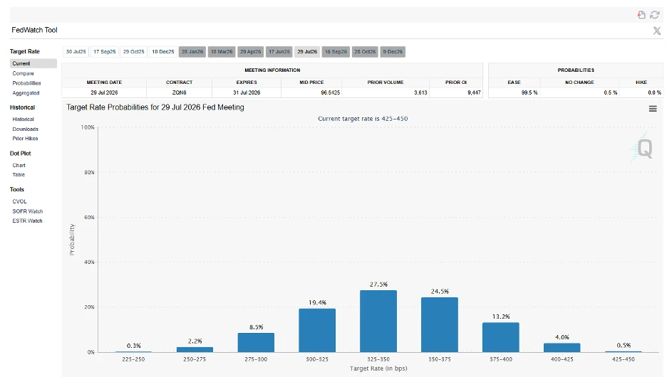 根据 CME Fed Watch 预测,到 2026 年中期,联邦基金利率将降至 3.25% 或更低。与此同时,Ethereum 链上质押收益率(目前约为 3.5% 年化利率)有望因网络活动和手续费的增加而上升。