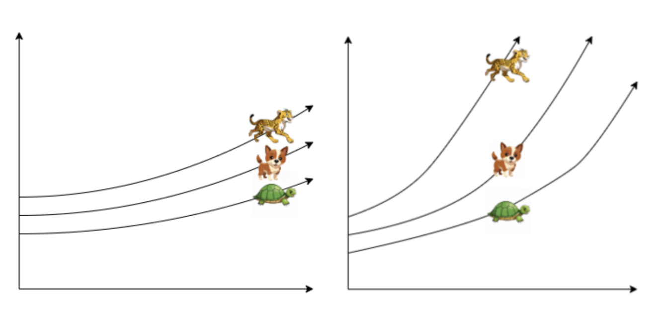 左图:比例增长模式,初始阶段的细微差异,最终仍保持微小差距;右图:规模经济增长模式,初始阶段的细微差异,随时间推移会演变为巨大差距。
