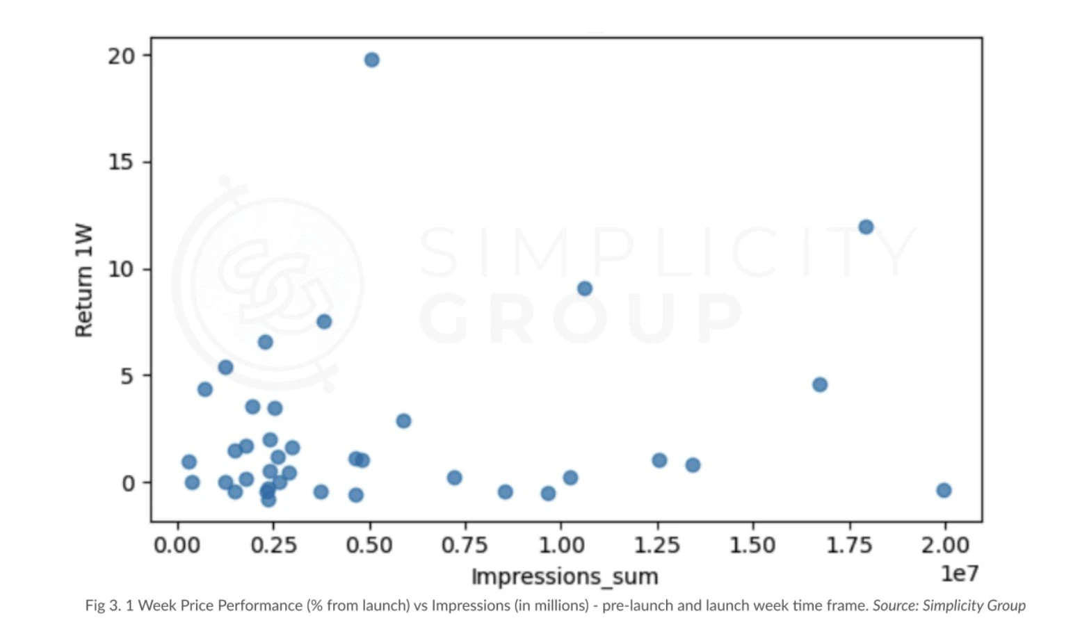 与一周价格表现的相关性?基本为零。 Simplicity Group 的回归分析显示,互动指标与价格表现的 R²仅为 0.038 。简单说:互动量几乎无法解释代币成功与否的差异。