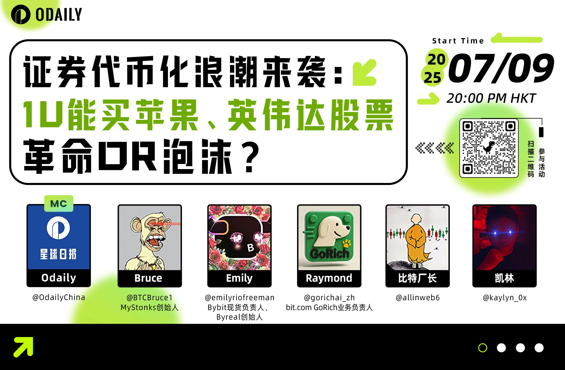 值此风口,Odaily星球日报于本周三成功举办线上 Space《证券代币化浪潮来袭: 1 U 能买苹果、英伟达股票,革命 OR 泡沫?》,特邀 MyStonks、Bybit & Byreal、GoRich 等交易平台以及知名加密 KOL,分别从平台运营与用户视角深入探讨证券代币化关键议题。