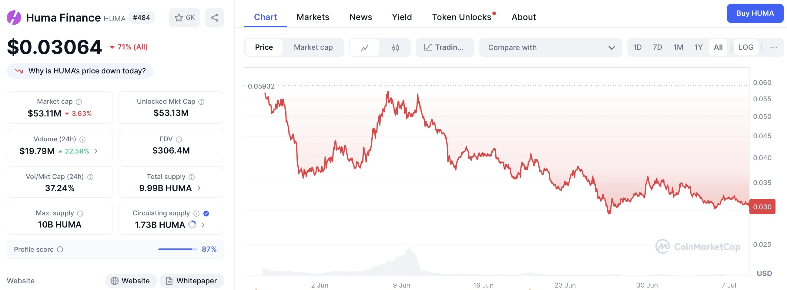 在 6 月初短暂稳定在~ 0.05 美元左右后,价格在接下来的一个月里稳步下跌,从 6 月 9 日到 7 月 7 日下跌了 40% 。这一趋势不仅反映了获利了结,也反映了缺乏粘性需求的更广泛现象。日交易量较第 1 天高点下降超过 90% ,FDV(3.08 亿美元)与实际市值(5344 万美元)之间不断扩大的差距强化了这样一种认知: HUMA 的大部分吸引力是由活动驱动的,而非产品驱动的。