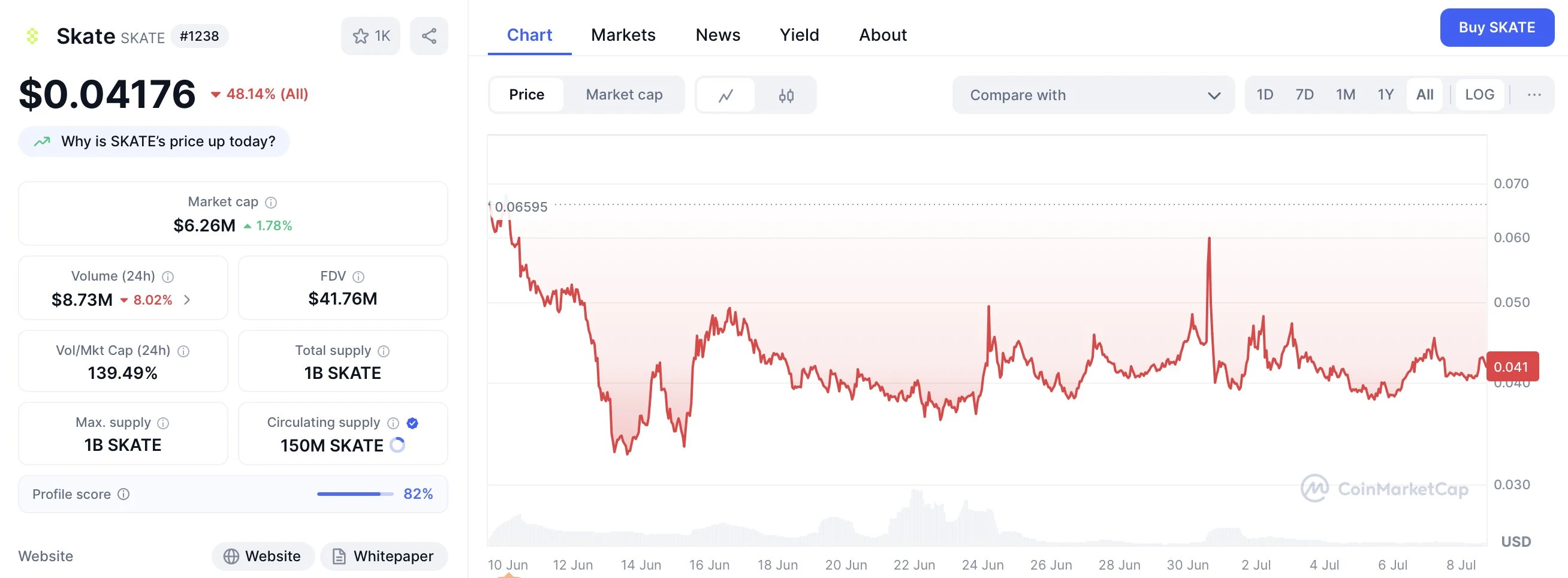 SKATE 的早期交易反映了一个充满希望的开局。6 月 10 日,该代币的兴趣急剧上升,峰值达到 0.06539 ,但迅速回调,收盘于 0.05094 附近,仅在首日就回撤了约 22% 。