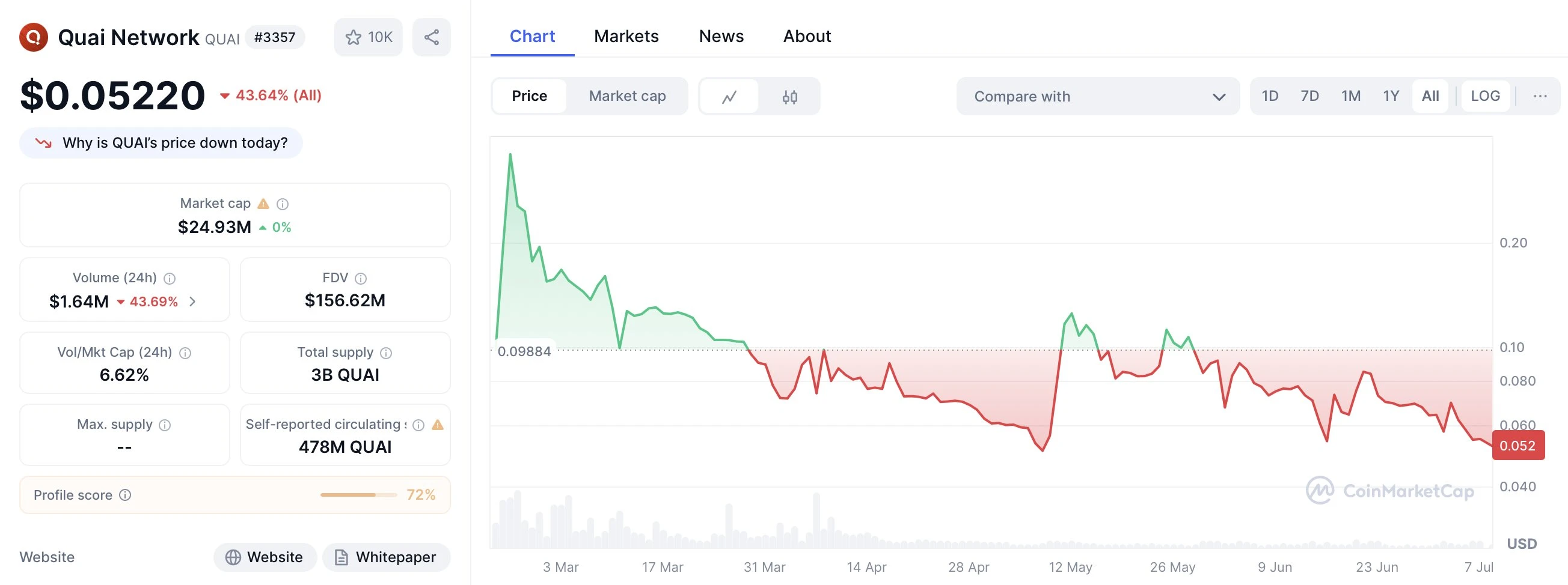 QUAI 现在的交易价格低于发行价,自 3 月以来没有出现任何有意义的复苏,这是一个研究“ 早期流动性≠持久信念” 的典型案例。
