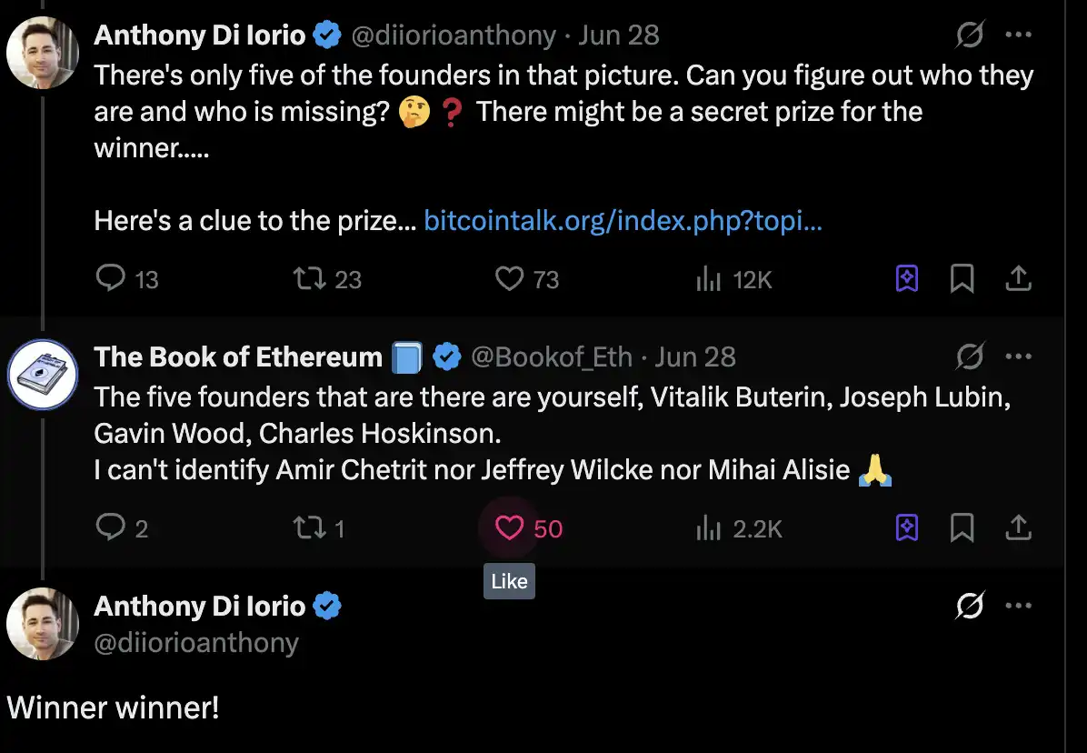 同时,该项目也受到以太坊生态核心人物的关注,最近爆火的以太坊微策略 SBET 的高管 Joseph Lubin 关注了 $BOOE 的项目推特。以太坊联创 Anthony 公开互动「Winner winner」对项目表示支持,令 $BOOE 在文化与资本双重维度上,具备了爆发前的全部想象力。