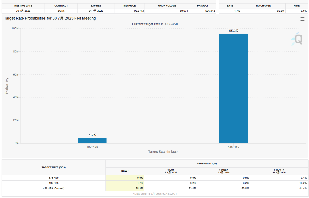 从老生常谈的宏观环境而言,喜忧参半,环境不确定性仍然存在。全球各国还在关税上打擂台,美国的关税函件陆续公布,让一众国家处于焦虑中,但随着关税这一武器成为常用手段,全球市场对该工具已然产生了见怪不怪的心理,尽管大棒还在挥舞,也早已没有解放日般引发恐慌。另一方面,视角回到美国,根据美国劳工部3日发布数据,美国6月非农部门新增就业14.7万人,失业率为4.1%,环比下降0.1个百分点。就业数据明显好于市场预期,再度降低了美联储降息的可能,最新的CME“美联储观察”数据显示,美联储7月维持利率不变的概率高达95.3%。