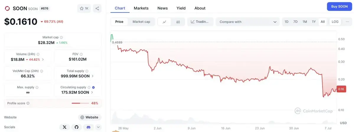 SOON 具备成功发行的所有要素:强大的基础设施宣传、币安 Alpha 平台的曝光度以及社区激励机制。但该代币在六周内下跌了 66%,这表明炒作并未转化为坚定的支持。