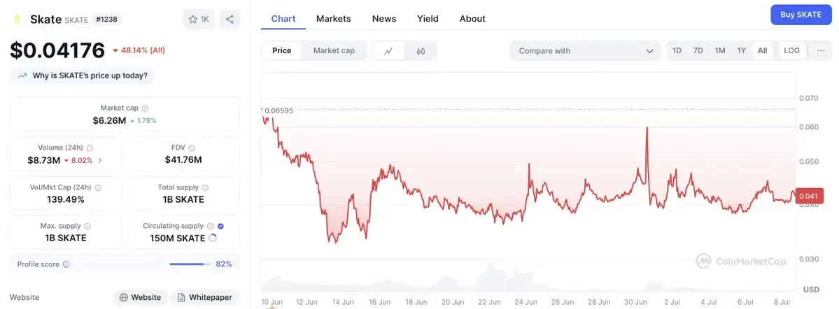 SKATE 的早期交易展现出良好的开局。6 月 10 日,该代币的关注度急剧上升,价格一度飙升至 0.06539 美元,但随后迅速回调至 0.05094 美元左右,仅第一天就出现了约 22% 的回撤。