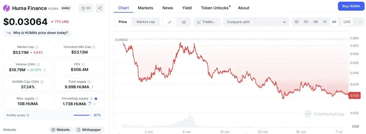 在 6 月初短暂稳定在约 0.05 美元左右后,接下来的一个月里价格持续下跌,从 6 月 9 日到 7 月 7 日跌幅达 40%。这一趋势不仅反映了获利了结,还反映出缺乏持久的需求。日交易量从第一天的高点萎缩了 90% 以上,而 FDV(3.08 亿美元)与实际市值(5300 万美元)之间的差距不断扩大,进一步强化了市场认为 HUMA 的大部分吸引力是靠活动驱动而非产品本身的观点。