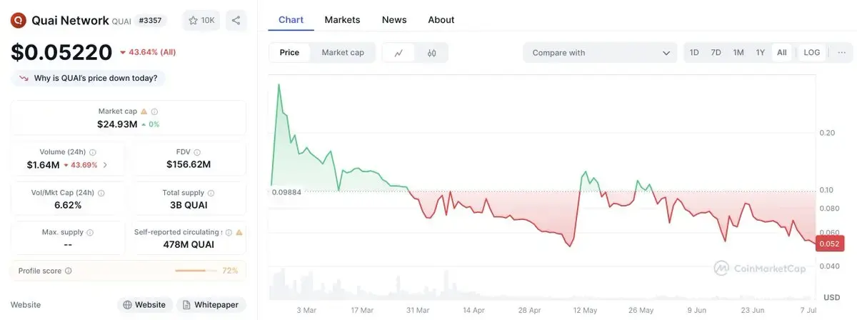 QUAI 目前的交易价格已低于发行价,自 3 月以来一直未见明显回升,这充分说明了早期的流动性并不等同于持久的信心。