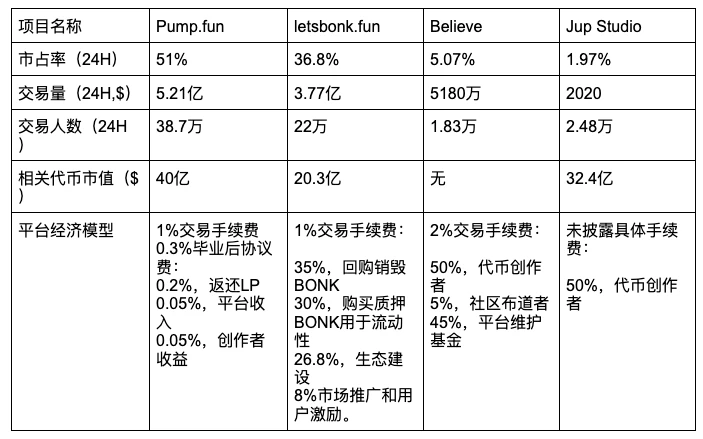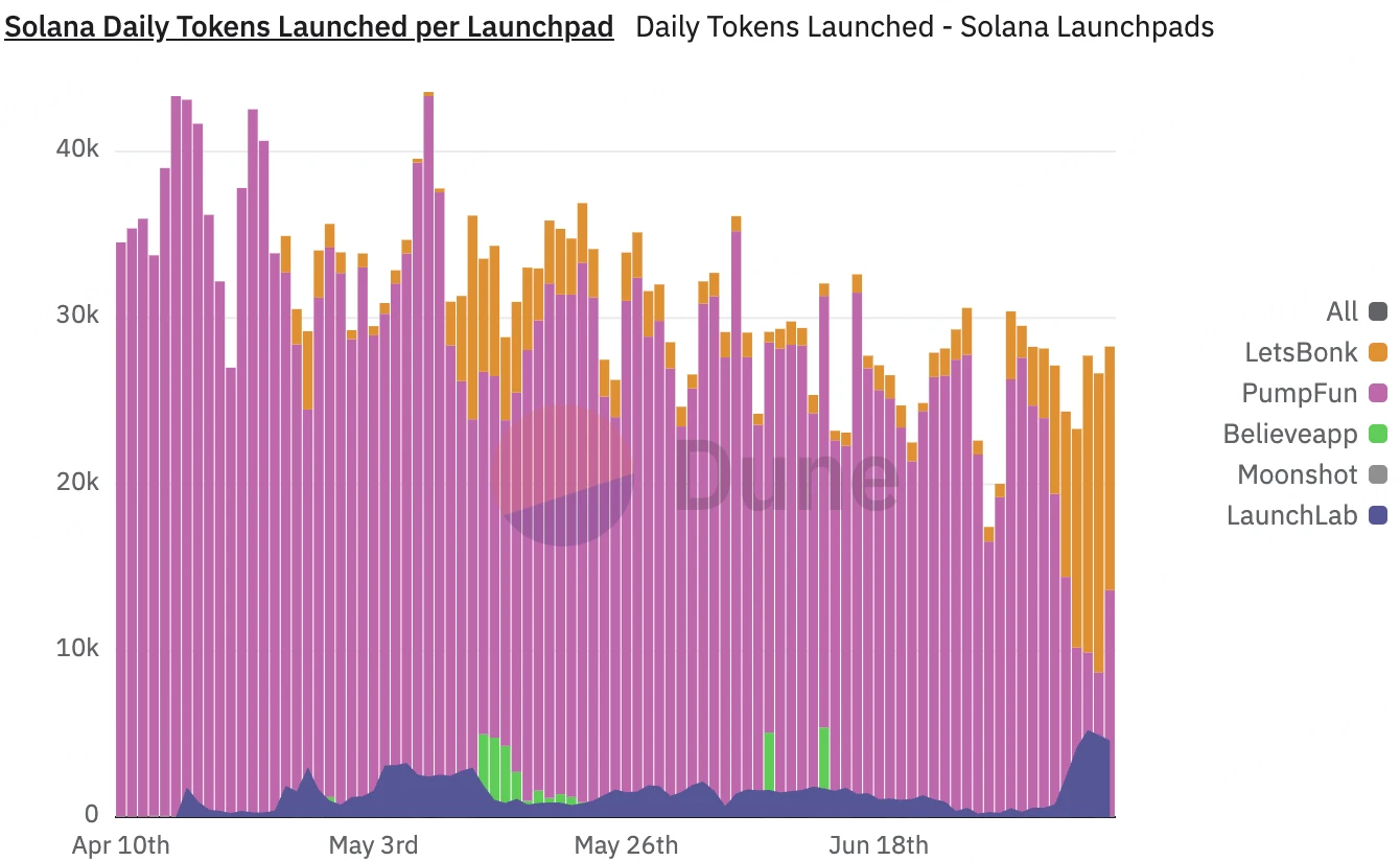 自 2024 年 1 月上线以来,Pump.fun 已累计收入近 6.7 亿美元,其中单日手续费峰值则接近 700 万美元 。这曾让其一度垄断 Solana 生态 MEME 代币发射平台的霸主地位。然而,就在 PUMP 即将发行之际,竞争对手 letsbonk.fun 强势崛起。letsbonk.fun 以 15, 600 次代币发行超过 Pump.fun 的 11, 500 次,以 49.8% 的市场份额颠覆前者 40.9% 的垄断地位,这是自 2024 年 1 月以来,Pump.fun 首次在 Solana MEME 市场份额上被对手超越。尽管随后 Pump.fun 重新回到市场第一的位置,但这次被超越的经历引发了市场对其垄断地位的质疑,也显示出其在短期内存在被其他平台替代的可能性。