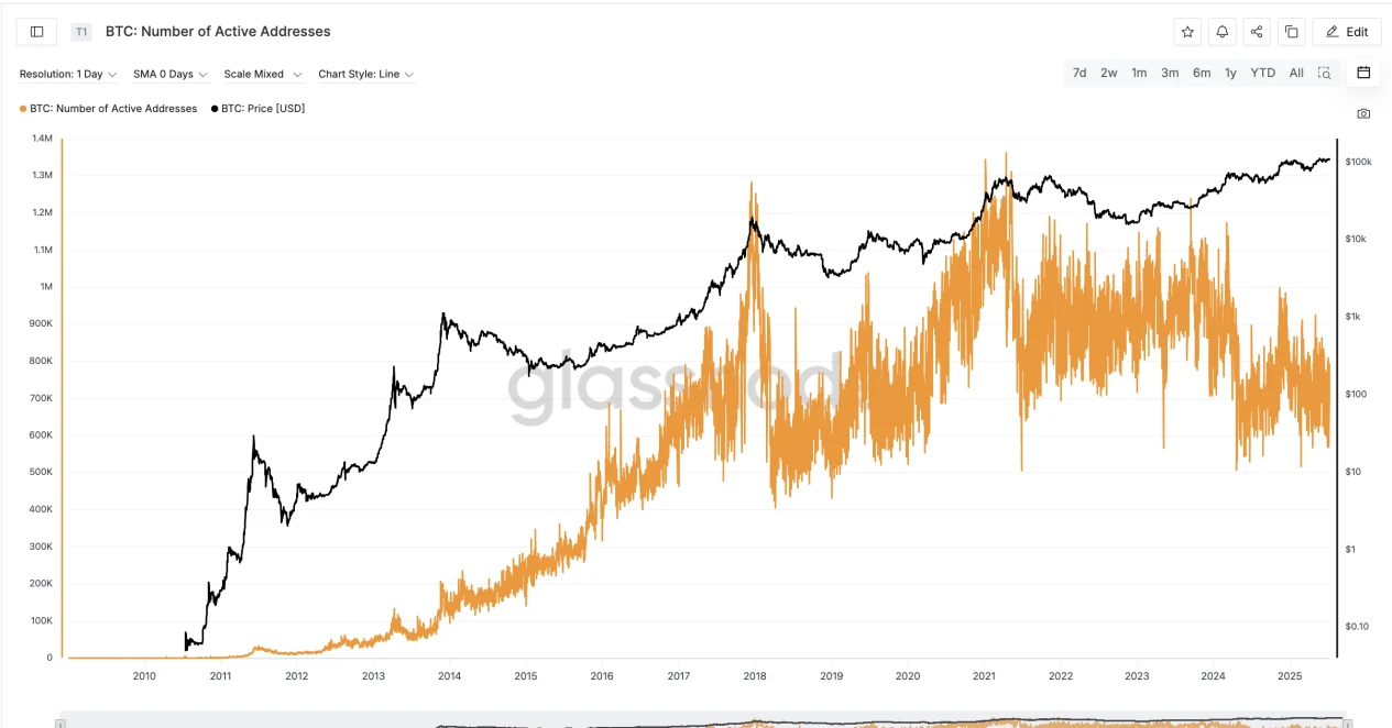 本轮牛市中出现了一个有趣的现象:尽管比特币价格屡创新高,链上活跃地址数却并未同步激增。Glassnode 数据显示, 7 月 9 日,当前比特币网络每日活跃地址数约在 77.5 万左右 ,与 2019、 2020 年等多个时期水平相当。这意味着虽然 BTC 价格已经上涨数倍,但新用户和新资金的涌入相对有限,市场更多是由存量资金推动。这种价格涨、活跃地址不涨的背离反映出本轮行情的主要驱动力并非散户的广泛参与,而是机构资金和长期持有者的行为。
