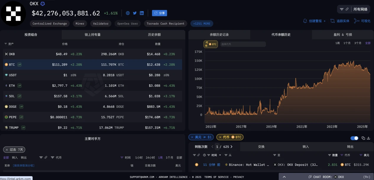 但与之相对的是,据 Arkham Intelligence 数据显示,OKX 交易所钱包持有的 BTC 数量整理呈现上升趋势:自 2019 年 4 月起迅速增长,并在 2023 至 2024 年间维持在高位平台;但从 2024 年中至 2025 年有所回落,这一变化也与其他交易所 BTC 余额的走势形成相互印证。截至 7 月 10 日,OKX 钱包当前持有 BTC 数量为 11 万+枚。