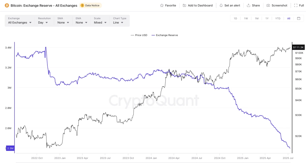 据 CryptoQuant 数据,截至 2025 年 7 月,中心化交易所持有的 BTC 余额已降至约 240 万枚,占比特币流通总量的约 12% ,创下近四年新低。自 2024 年初以来,该指标持续下行,并在 2025 年第二季度出现加速回落,与 BTC 价格的上涨趋势形成鲜明对比,呈现出典型的牛市特征:交易所“出金潮”往往预示中长期上涨结构的确立。