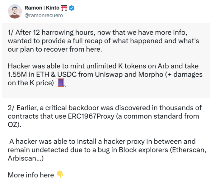 黑客在 Arbitrum 网络上无限量铸造 K 代币,并从 Uniswap 和 Morpho 平台窃取了价值 155 万美元的 ETH 和 USDC(此外还造成了 K 代币价格的损失)。此前,在数千份使用 ERC1967Proxy(OpenZeppelin,简称 OZ,提供的一个常用标准)的合约中发现了一个严重后门。黑客能够利用区块链浏览器(如 Etherscan、Arbiscan 等)中的漏洞,在中间植入黑客代理且未被察觉。 Ramon Recuero 称许多团队都收到了通知并且堵住了漏洞,然而 Kinto 并未收到通知,黑客迅速控制其在 Arb 上的代币,并在补丁发布之前使用代理进行攻击。北京时间下午 4:34 ,黑客铸造了 11 万枚 K 代币并开始攻击,以耗尽 Morpho Vault 和 Uniswap v4 池。