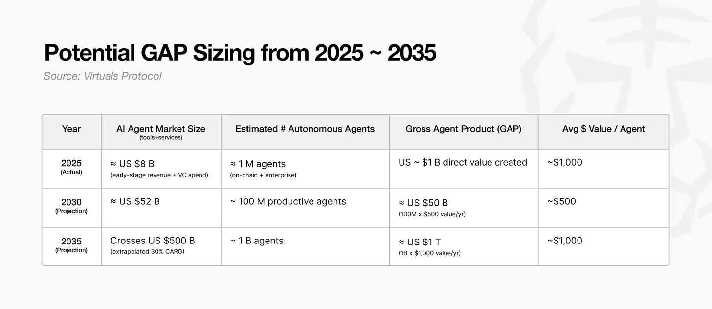 截至 2025 年,约有 100 万个公共代理在链上运行。每个代理每年创造约 1, 000 美元的价值。代理创造的总经济价值达到约 10 亿美元。这被称为总代理产值(Gross Agent Product,GAP)。如果这种趋势持续下去,预计到 2035 年其规模将增长至 1 万亿美元。