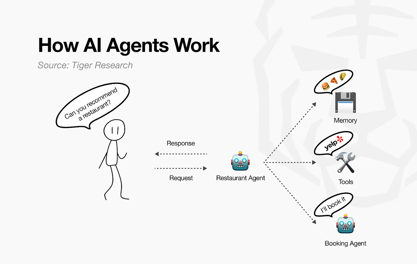 例如,假设用户需要预订晚餐餐厅。现有的生成式 AI 模型可以回答诸如“推荐一家首尔氛围好的韩国餐厅”这样的问题。但它们无法检查空位或帮助预订。代理的工作方式不同。它们会考虑用户偏好(地点、类型、时间段)。它们会搜索受欢迎的餐厅。它们可以帮助进行实时预订。