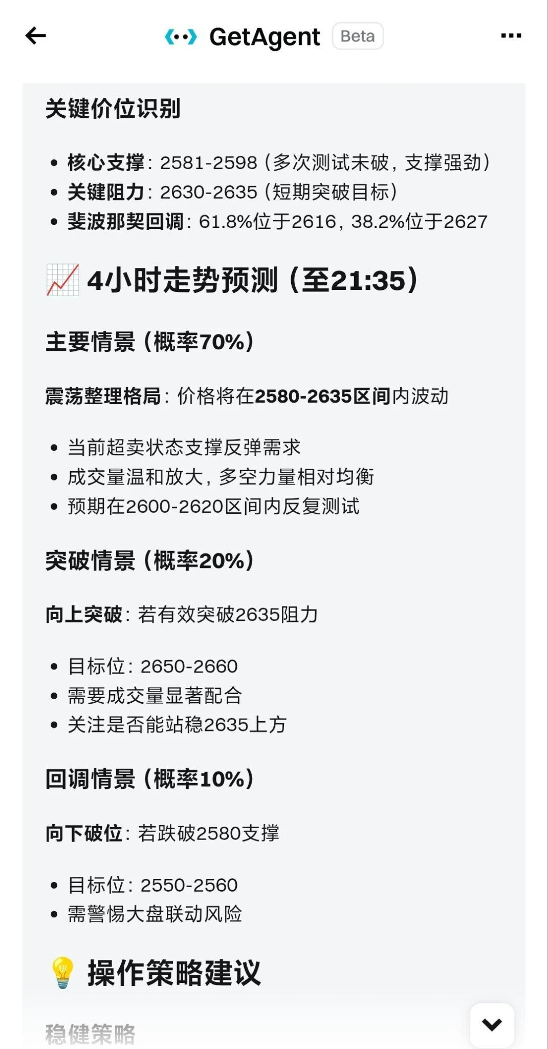 GetAgent 对于某个币种的价格分析分别给出了当前市场概况、技术指标(包含 EMA、MACD、KDJ、RSI、MACD、布林带等指标)、明确的支撑位、阻力位,并最后会根据稳健和积极两种风格给出止盈止损点位,最后做出相关的风险操作建议。