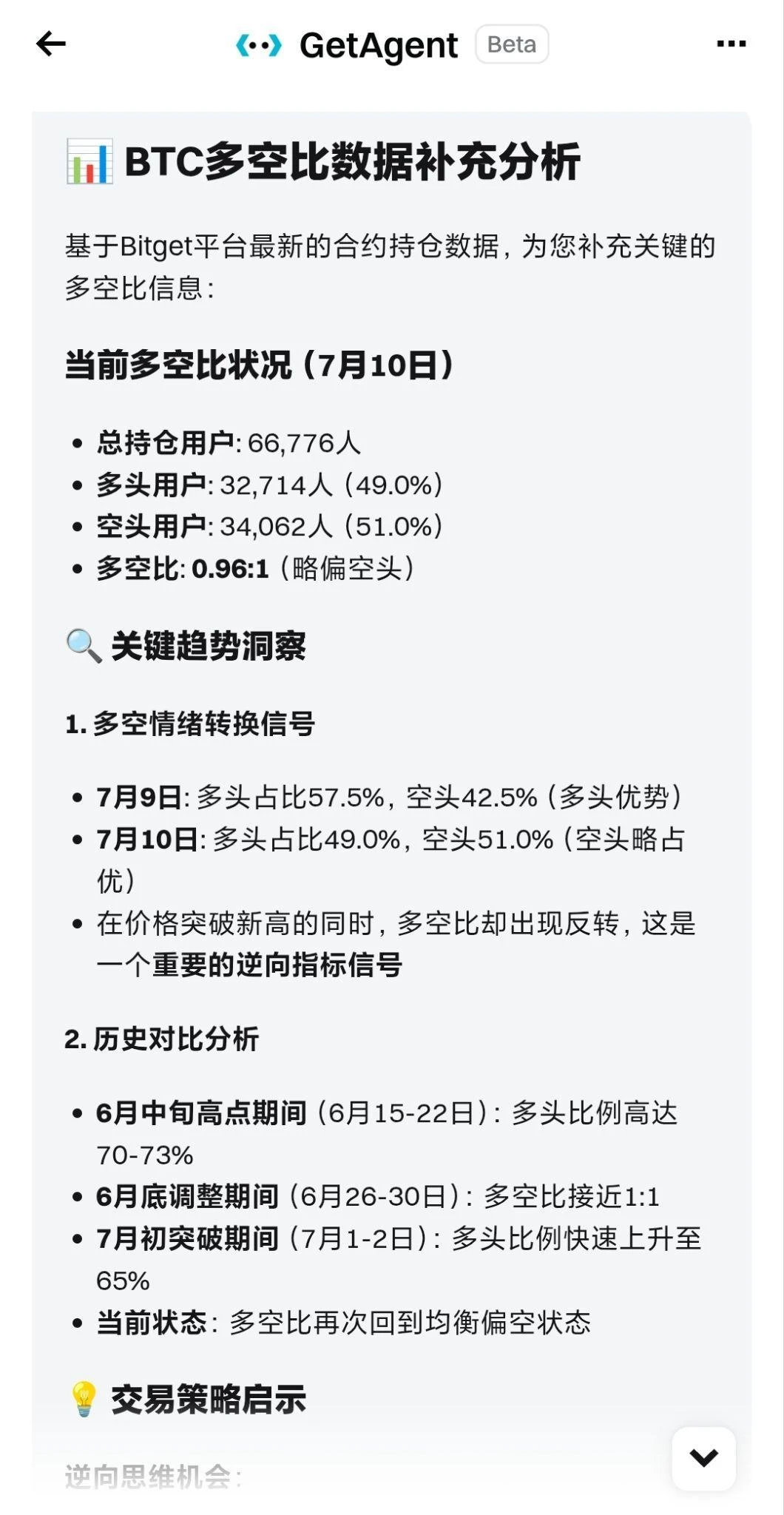 GetAgent 全面从信息面角度列出了原因,并从技术面突破做了进一步的分析和补充。呈现的信息非常清晰、简洁,省去了很多检索信息的时间。此外,在这个测试问题的对话中,我又补充提问了 BTC 当前的多空比数据,GetAgent 帮我调取了 Bitget 平台最新的合约持仓数据,并提供了情绪转换以及历史对比分析,更好地帮助用户透过数据看到本质,提供更全面的建议。