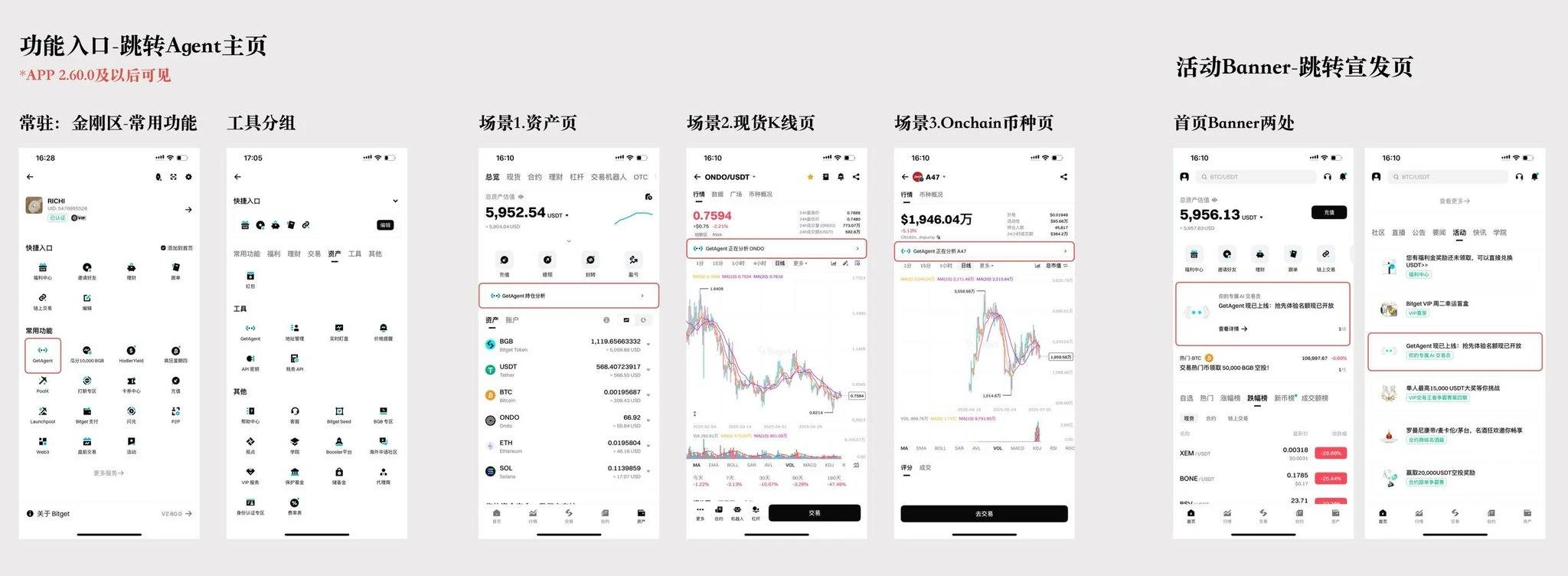 GetAgent 形式为对话互动式 AI,常驻 Bitget 「常用功能」区,方便用户获得。此外在资产页、现货 K 线页面、Onchain 币种页都有相应入口,可以结合不同场景使用。