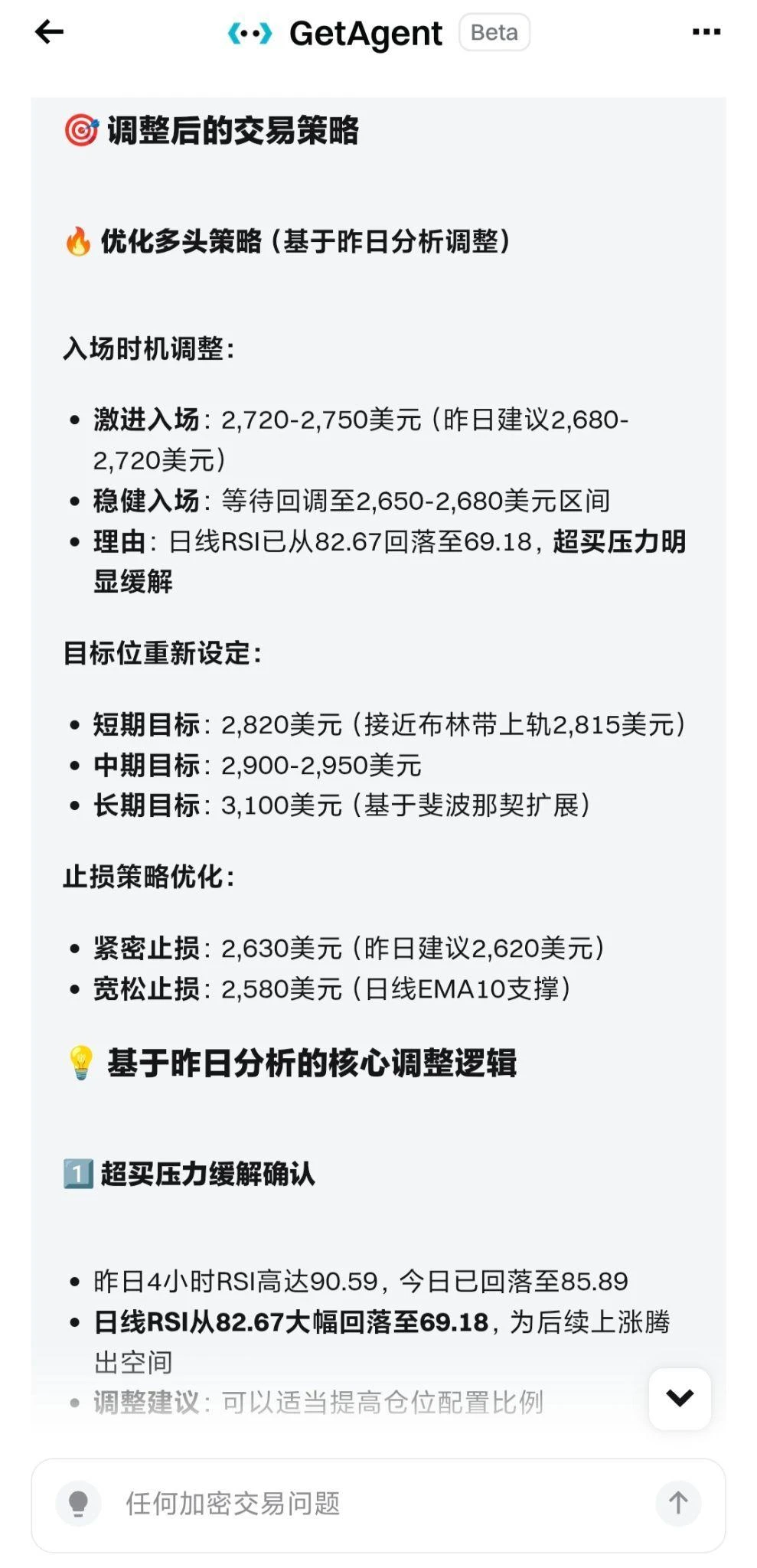 GetAgent 对比昨日的询问做出了历史分析,并且逐一验证和纠正了自己在昨日的测试,并给出相应的调整建议。不难看出,GetAgent 基本可以实现在与用户的多次交互中优化建议,并逐步持续输出更精准、更贴合的决策支持。