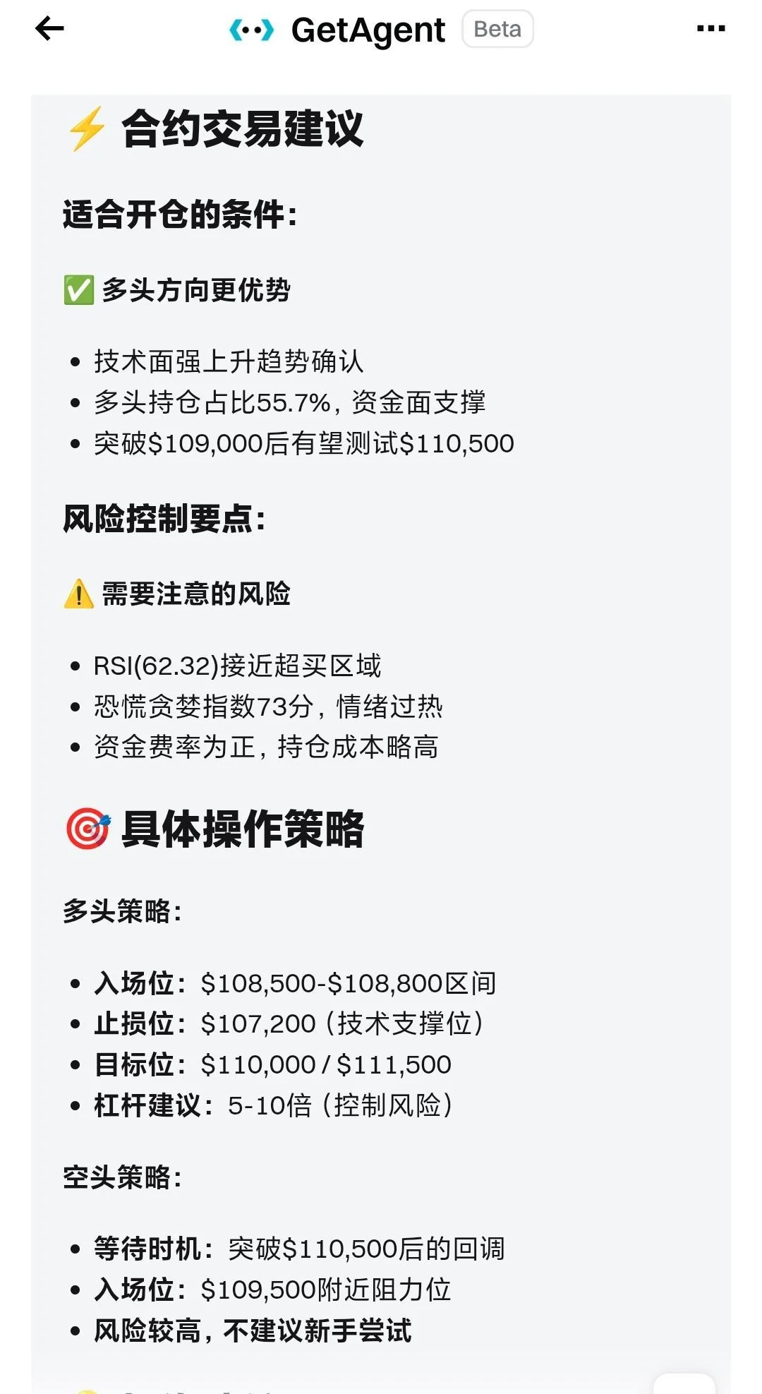 相比其他 AI 工具提供的模糊判断,GetAgent 对新手和短线选手都很友好。在这里需要提醒的是,任何外部建议都有一定的风险,建议交易者尤其是新手在小额测试胜率后再上大仓位。但以我这几天的个人测试结果来看,GetAgent 的胜率要高于我个人纯凭感觉判断,比如,我在 7 月 7 日曾提问 BTC 的合约交易方向,这是 GetAgent 给出的建议: