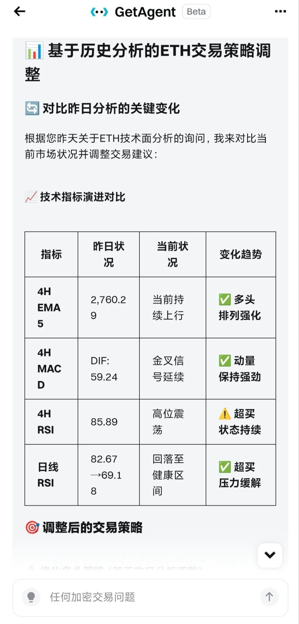测试问题:基于「测评 1 」的“ETH 的价格趋势”的相关问题,我又在 24 小时后请 GetAgent 调整了 ETH 交易策略,其回答如下:
