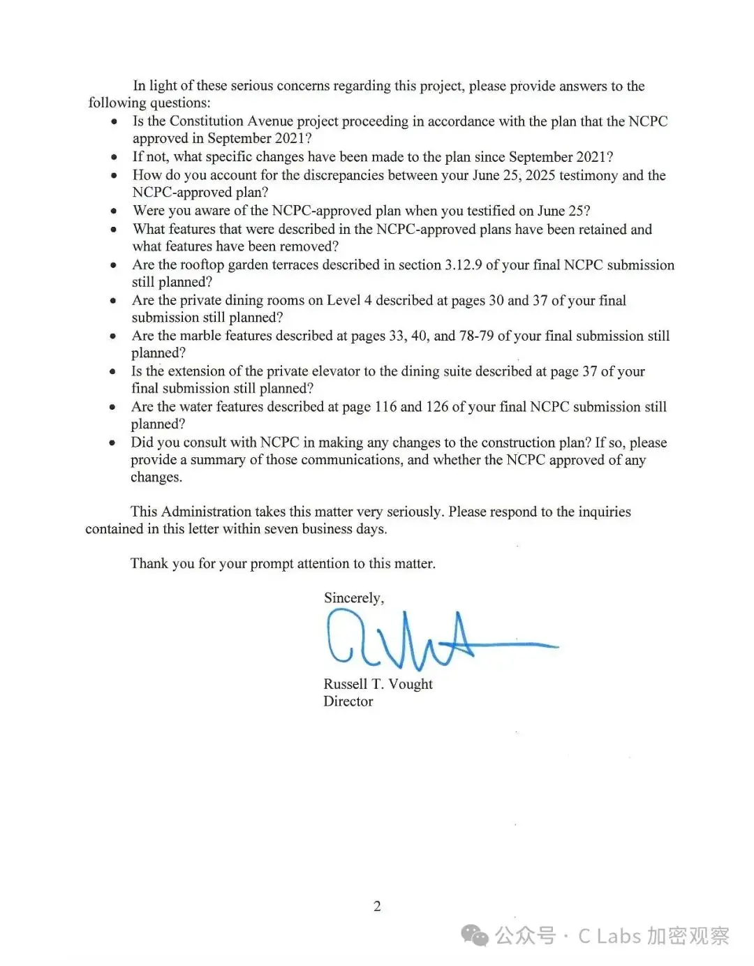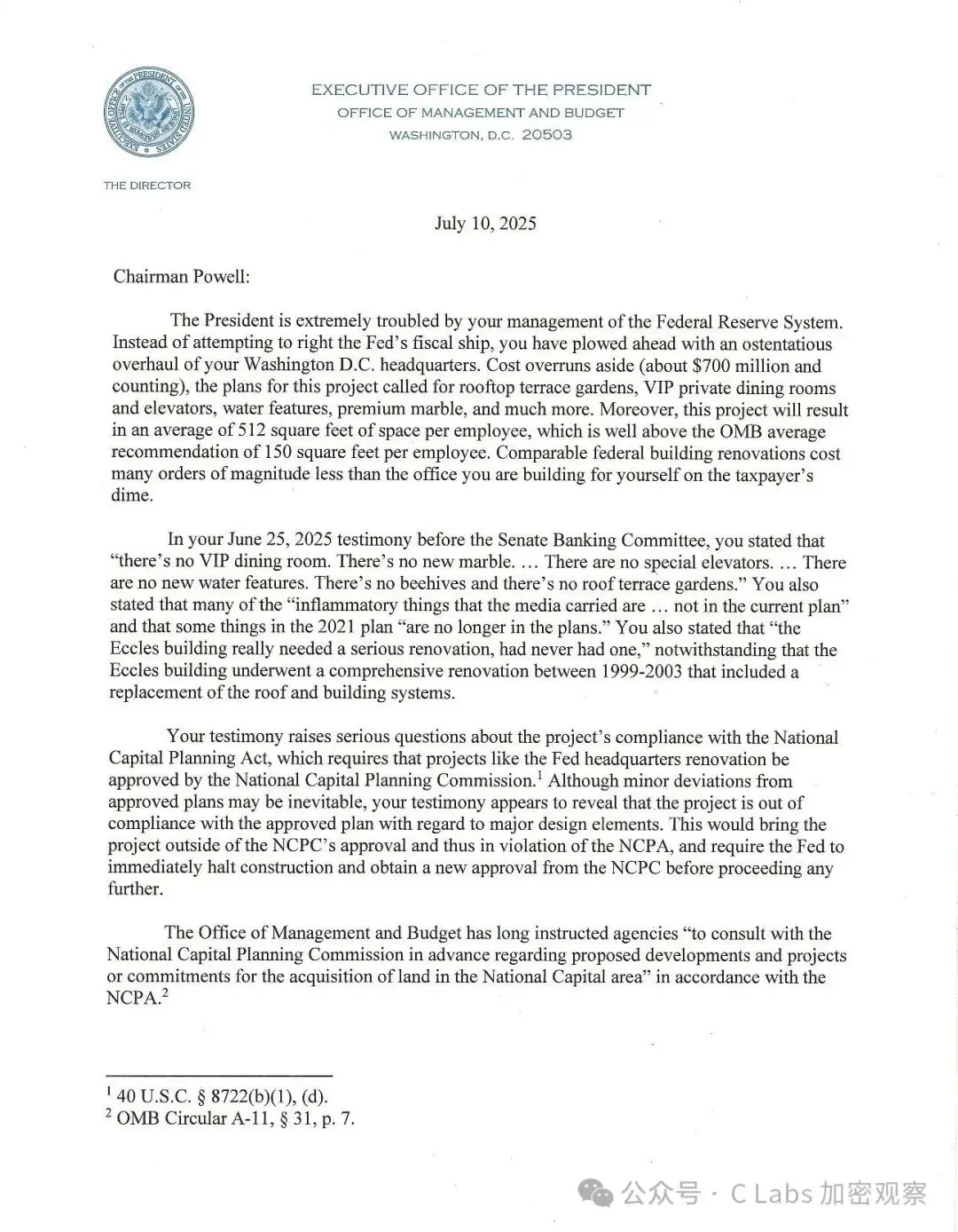 这封来自白宫的公函表示,总统对鲍威尔「挥霍纳税人资金、大兴土木」的行为表「极度担忧」。而且项目成本超支(已达 7 亿美元以上),包括:屋顶花园、VIP 私人餐厅、豪华电梯、水景装置、高级大理石等。
